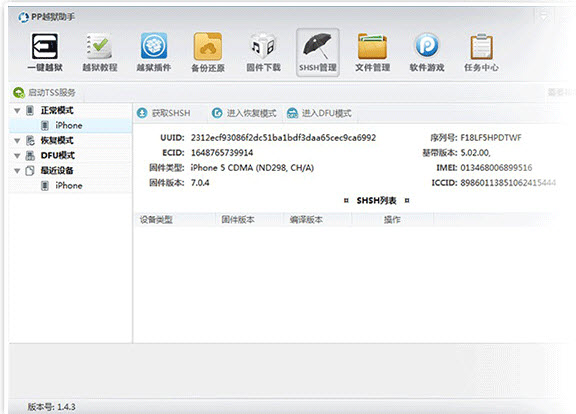 广大用户在使用PP越狱助手越狱前,务必要提取旧固件的SHSH,只要连接上PP越狱助手点击获取SHSH的按钮,一键即可完成旧固件SHSH的备份。