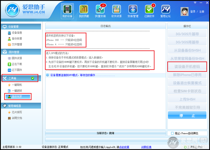 设备一旦进入到DFU模式,爱思助手立即开始“获取开机密码”!显示如下: