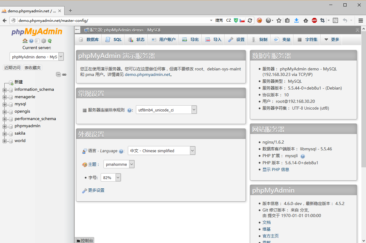 phpMyAdmin可以管理整个MySQL服务器(需要超级用户),也可以管理单个数据库。为了实现后一种,你将需要合理设置MySQL用户,他只能对允许的数据库进行读/写。那要等到你看过MySQL手册中相关的部分。