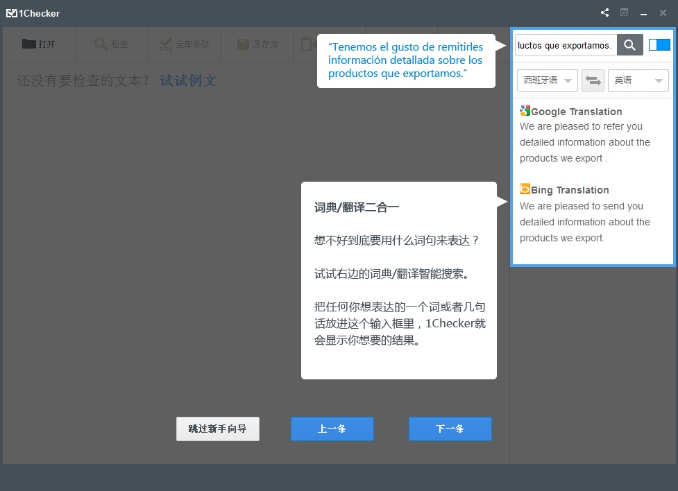 一键检查拼写、语法等错误 - 轻松让您进行英语文本拼写检查、语法纠错和写作润色,更有错误解释、例句展示、翻译和词典等功能来协助您更快速改正错误、提高写作水平。