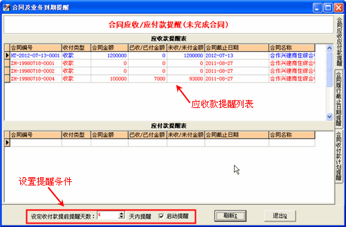 在软件中,汇总有七种分别为:合同编号汇总、往来单位汇总、所属部门汇总、合同类别汇总、所属项目汇总、业务员汇总、商品首付汇总,可从主菜单中进入;其中,[5合同及业务到期提醒]是根据合同提醒天数设定,对程序中的历史纪录进行汇总,将符合条件的记录显示出来,提醒管理员该先处理那些事了。如下图: