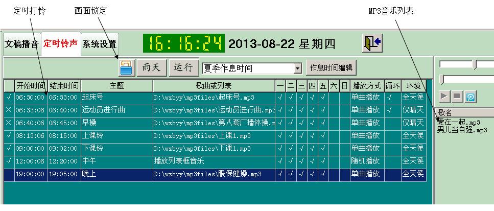 4、可以设置定时打铃(播放声音文件),特别适合幼儿园、小学、中学、大学等当做校园铃声及校园广播。