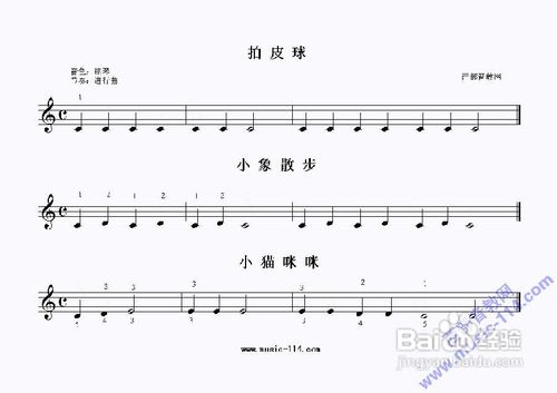 先作右手在原位的断音练习。从这里开始,你将接触到较多的五线谱曲子。如果你已经懂得看了,开始用的曲谱对你来说简直是“小儿科”;如果你不懂,那就得补学点看谱的知识了(附:五线谱常识,供不懂看谱的补学)