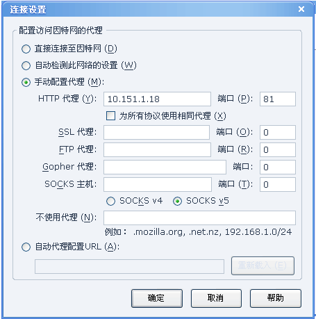 选择“手动配置设置”,在“HTTP代理”处填入“127.0.0.1”,端口处填入“8800”,其它项全部为空。
