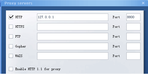 选择“代理设置(Proxy Servers)”,在“HTTP代理”处填入“127.0.0.1”,端口处填入“8800”,其它项全部为空。