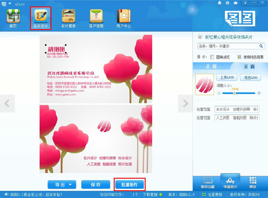 点击喜欢的模板进入“名片设计”界面,在模板下方找到“批量制作”,即可开始批量制作名片。