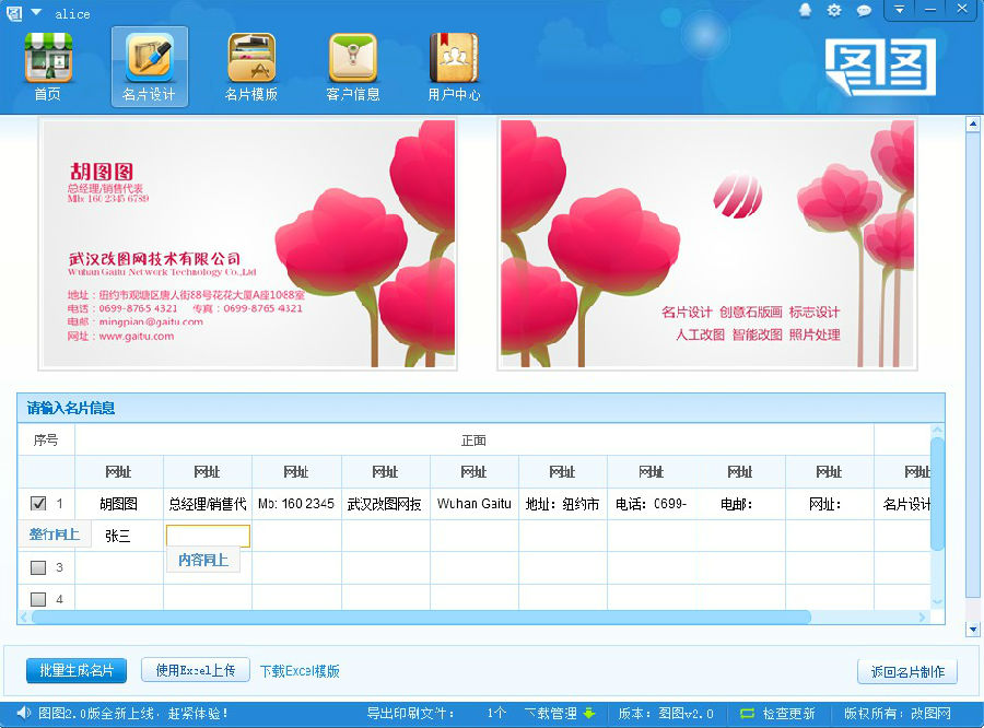 输入名片内容有两种方式可供选择:在页面的表格上填写或下载Excel模板。