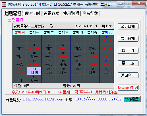 悠悠闹钟是款用来日期查询、闹钟定时的实用小工具,日期查询可以查询公历日期、农历日期、属相、星座,还可以Internet对时,闹钟定时可以设置整点报时、每天定时、明星报时,精心设计,完美报时。