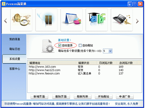 点击“系统设置”→“自动刷站”按钮设置系统自动刷站,它将使您最近刷过的网站进行自动刷新该网站的流量,如下图:
