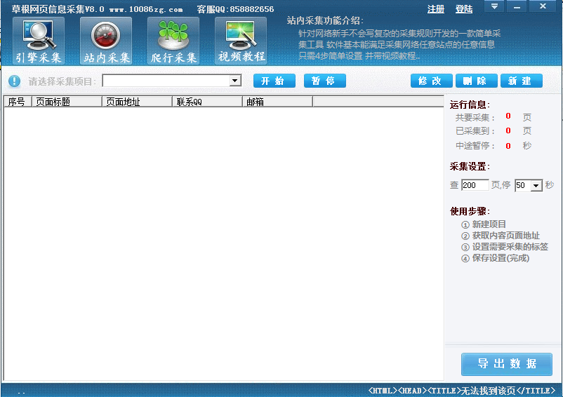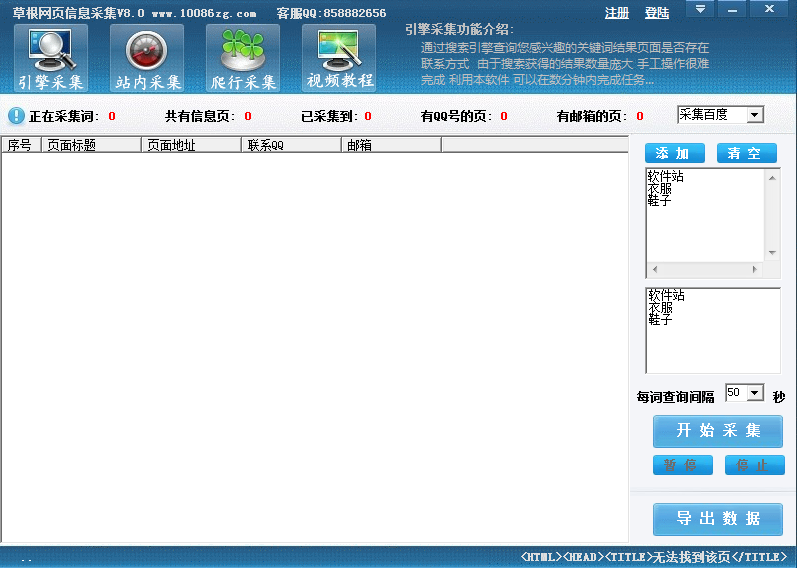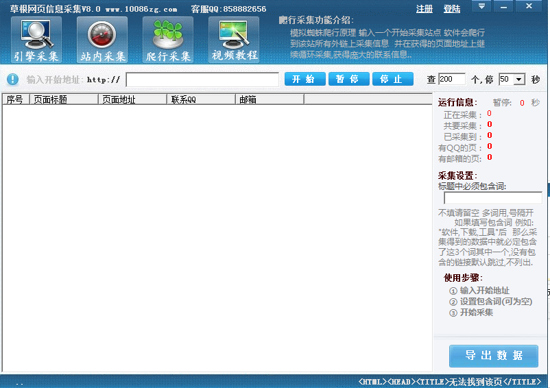 草根网页信息提取工具是一款可以批量提取多个网页信息的工具,提取的方式很多,可以进行搜索引擎提取、站内信息提取、模拟蜘蛛爬行提取,可以将网页的页面标题、页面地址、联系方式(QQ、邮箱)进行提取,使用非常方便,提取速度很快,几分钟就可以完成大量的提取任务。