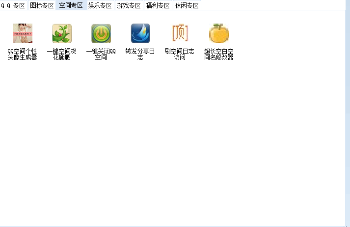 空间专区:QQ空间个性头像生成器、一键空间浇花施肥、一键关闭QQ空间、转发分享日志、刷空间日志访问、超长空白空间名修改器