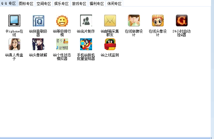 QQ专区:卡iPhone在线、QQ拼音刷机、QQ等级排行、QQ名片制作、QQ邮箱采集、在线举牌设计、在线头像设计、24小时自动挂Q器、QQ真人秀盒子、QQ头像破解、QQ个性状态模拟器、手机QQ脱机批量登录器、QQ上线检测