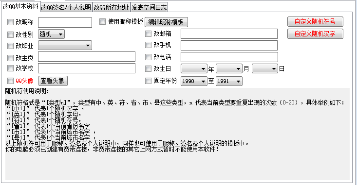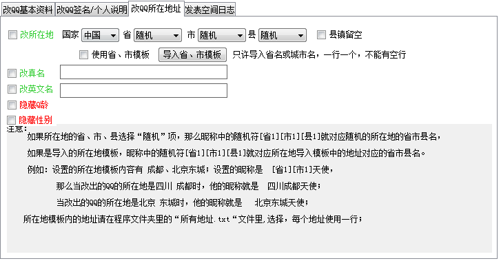 如果所在地的省、市、县选择“随机”项,那么昵称中的随机符[省1][市1][县1]就对应随机的所在地的省市县名,