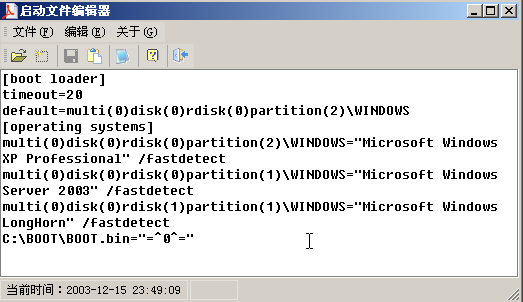 3、带了个简易的“文本编辑器”-用于编辑 BOOT.INI。因为在 98/2000/XP/2003 中 BOOT.INI 往往是“只读、系统、隐藏”的文件,在编辑时必须“显示系统文件”,且去掉相关的属性才能编辑保存,操作非常的不便。而“文本编辑器”在“保存”时会自动去掉原来的属性,是之可以正常的编辑,在保存后再恢复其原来的属性。