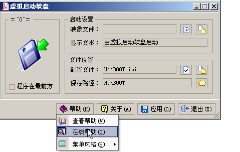 虚拟启动软盘可以将启动软盘集成进系统,直接从硬盘中启动支持光盘的DOS,软件多国语言支持、操作系统自适应版本,工具针对多个 BOOT.ini 的多引导系统提供预览、选择 BOOT.ini 界面,直接由启动软盘制作“启动软盘映像”的功能,省去使用 winimage 或 floppyimage 等软件的使用。