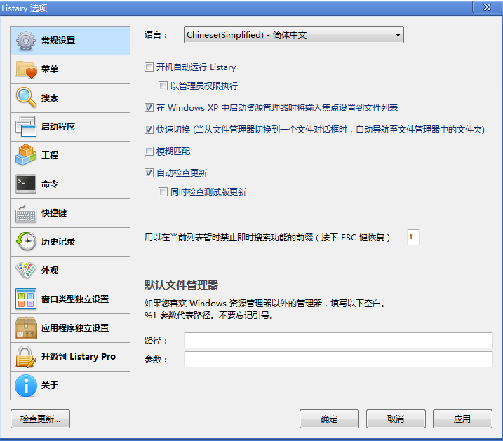 常规设置:语言、模糊匹配、检查更新、默认文件管理器