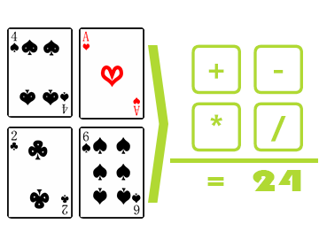 24点是个经典的数学智力游戏,把4个整数(一般是扑克牌A、2、3~K,也就是1~13),把数字进行加减乘除四则运算(可以有括号),结果得到是24,没个数字中能用一次,如6、2、7、4答案可以是(6 + 2) × (7 - 4)。大多数字组合都有多个答案。有些数字组合没有答案,也就是不可能得到24,比如10、2、12、2等。