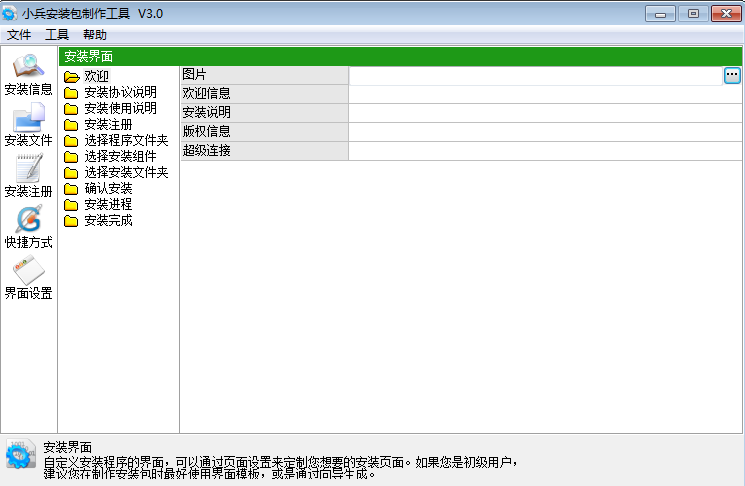 欢迎界面:欢迎信息、安装说明、版权信息、超级链接