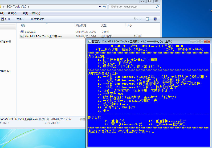 它是一款小米3刷机工具箱,专门针对小米3开发使用的,XiaoMI 3 BOX Tools具有一键root、一键重启recovery模式、一键救砖、一键刷机、一键修复小米3等相关功能,是小米最棒的工具箱。