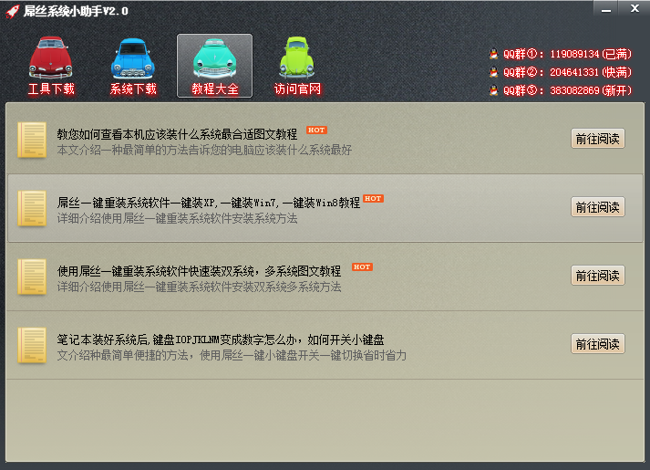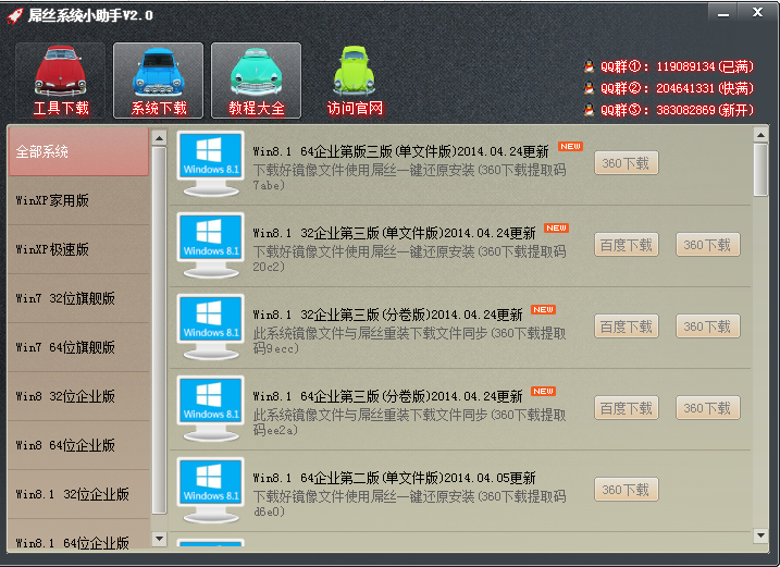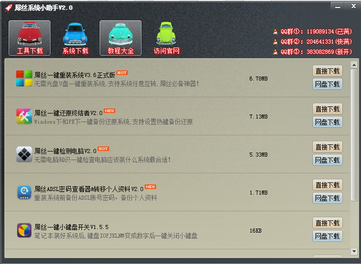 屌丝系统小助手收集了全部系统绿色小巧的软件!是一个系统工具大集合,收集了屌丝系列的全部系统镜像文件,并提供下载地址!此神器是对屌丝系列的一个总结,工具同步屌丝网站的更新!