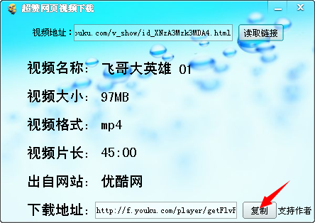 6、软件就会读取出该视频的视频名称、视频大小、视频格式、视频片长、出自网站、下载地址