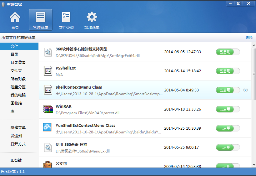 3、管理菜单里面大致分为:文件、目录、目录背景、文件夹、所有对象、磁盘分区、我的电脑、回收站、库等类别,所有的右键菜单你都可以自由的启用或是禁用。