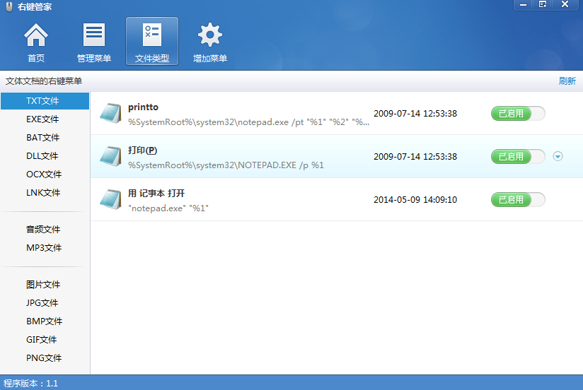 4、文件类型栏目,通过文件文档的类型来查看和管理右键菜单