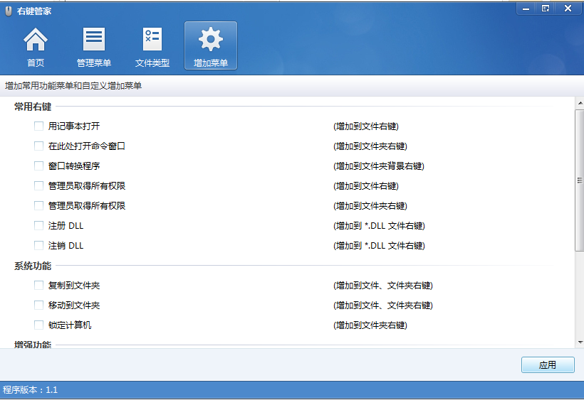 5、可以点击增加菜单按钮,进行右键菜单的增加,可以增加常用功能菜单和自定义增加菜单。