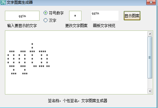文字图案生成器可以将用户输入的文字转换成精美的图案,支持符号数字和汉字的生成转换,可以用户签名档、个性签名等文字图案生成。