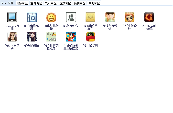 QQ专区:卡iPhone在线、QQ拼音刷级、QQ等级排行榜、qq名片制作、QQ游戏采集群发、在线举牌设计、在线头像设计、24小时自动挂Q器、QQ真人秀盒子、QQ头像破解、QQ个性状态模拟器、手机QQ脱机批量登录器、QQ上线监测