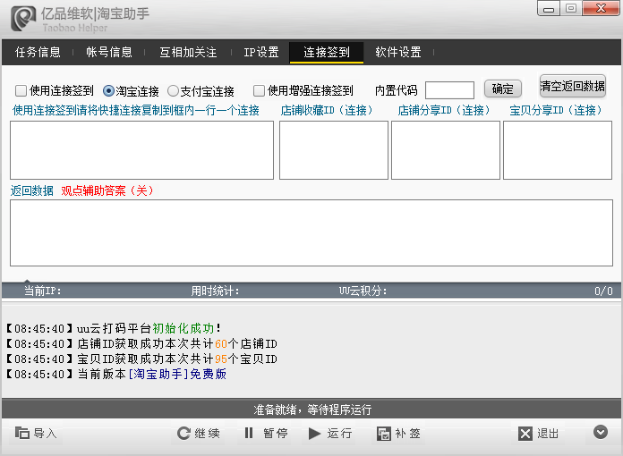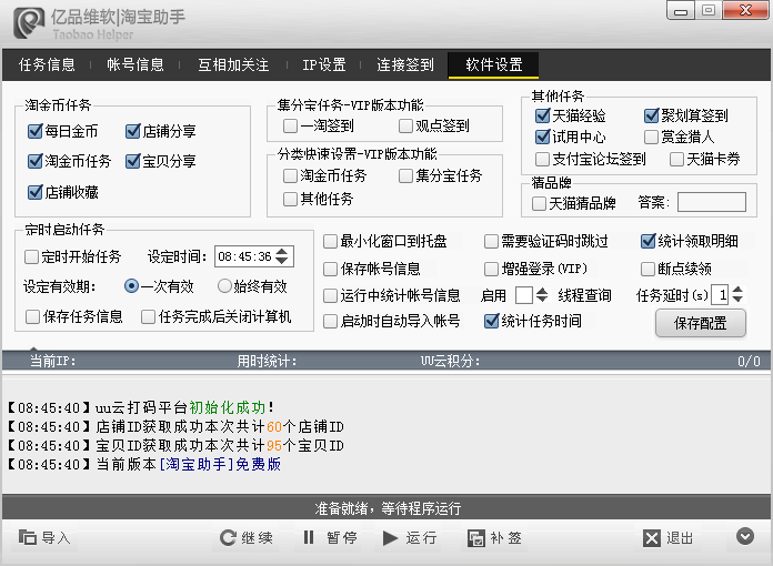 多帐号淘宝助手是一款多功能全自动帮助淘宝用户完成各种淘宝任务的一款辅助工具,可以每日自动一键完成淘金币任务、集分宝任务、淘宝抽奖等等,支持多帐号操作,适合那些拥有大量淘宝帐号的用户使用,工具功能齐全,十分智能,是淘宝达人必备工具!