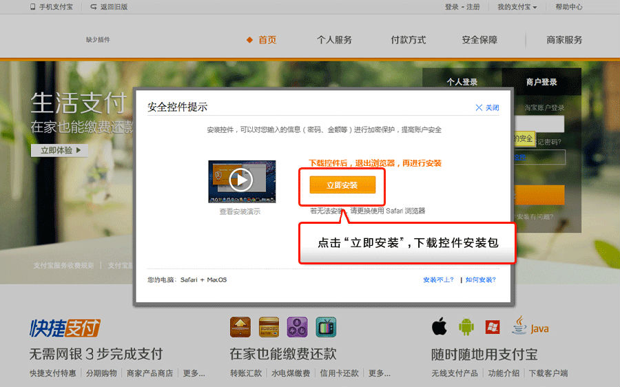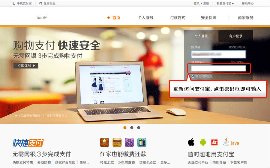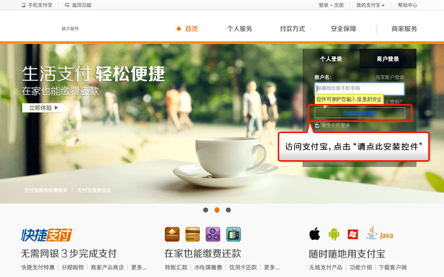 支付宝(alipay)是目前国内使用最为广泛的网络支付平台,它为您的网络交易提供安全保障。如果你经常在线购物,如淘宝网,那么对支付宝一定不会陌生。支付宝安全控件能够有效的保障用户密码安全,为账户的安全提供了可靠的保障。