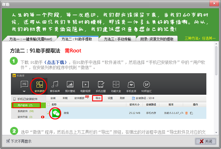微信记录导出助手是一款专门用于导出微信内容导出的工具。软件可以将微信的内容进行导出、备份、归类、语音转换等操作。很多用户都会遇到类似的问题。此版适用于安卓版微信导出备份使用。微信用久了,打开很卡,为什么,因为消息太多,可是又舍不得删除,因为没法备份,没法导出,使用本软件,一切都可以解决。