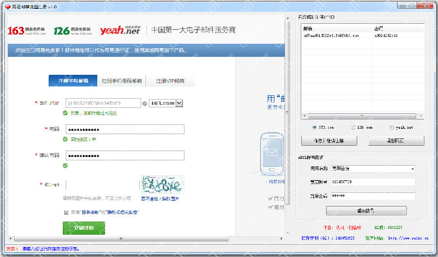 网易163邮箱批量注册机更换最新网页协议,是目前真实可用的一款网易邮箱批量注册工具。支持网易163、126和yeah邮箱批量注册。支持自动换IP和远程验证码识别。可以实现全自动快速批量注册邮箱。