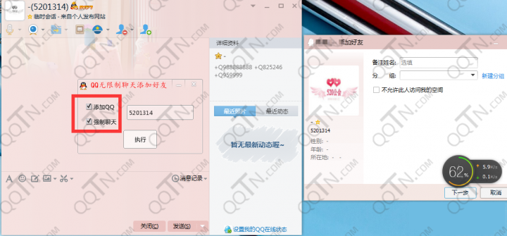 QQ强制聊天工具省去加好友的麻烦,直接强制聊天无阻碍!想必大家多遇到过这种情况,只是想临时找个人解决某个事情,没必要加好友,这是你便可使用QQ强制聊天器,打开一个临时会话窗口,便可开始聊天了;又或者你与别