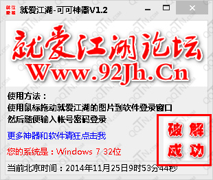 将“破解补丁”界面中右下方的“就爱江湖”按钮拖动到“机器码修改大师”界面中的“用户序列号”方框中