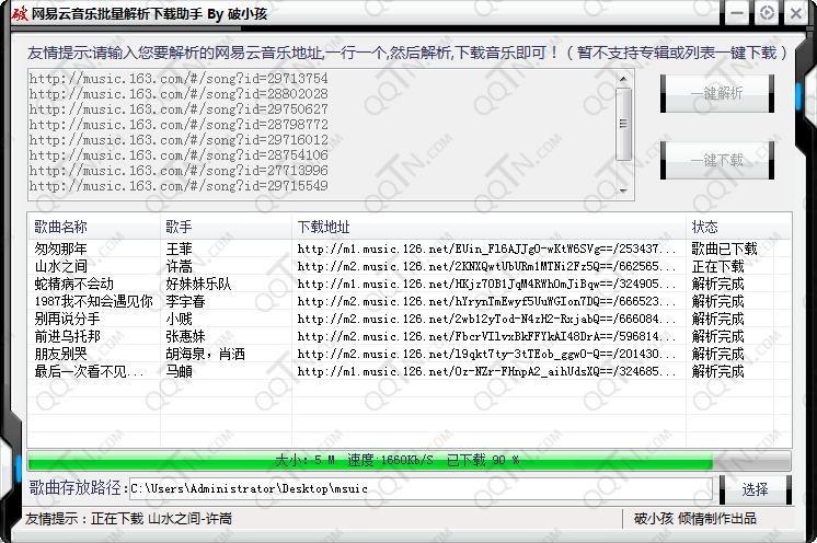 这是破小孩制作的一款用于网易云音乐批量解析下载工具,能够解析出网易云音乐歌曲真实地址,可以引用音乐外链,同时还能批量下载歌曲,无需安装客户端,就能轻松完成。需要的朋友下载试试吧!