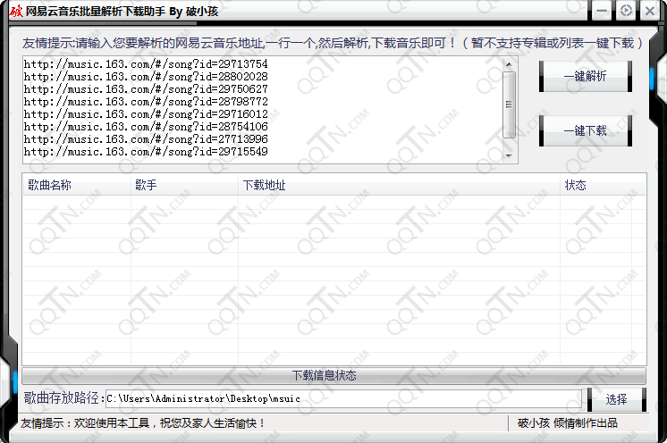 1、打开工具之后,输入要解析的网易云音乐地址,一行一个