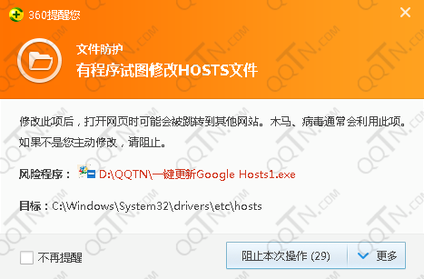 2、这时候,电脑中的安全卫士软件就会提示阻止,选择允许本次操作