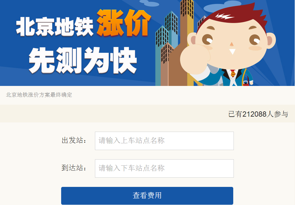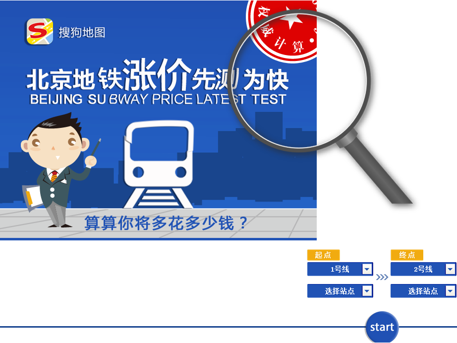 北京地铁涨价方案正式确定,并且从2014年12月28日起正式调价。那么广大北京市民就想知道涨价后,现在的交通成本需要多少钱就是大家最关心的。为了方便广大市民和各地游客清楚涨价后的地铁票价方案,所以也上线了北京地铁涨价票价计算器。搜狗地图也率先推出了北京地铁票价计算器,北京地铁涨价,先测为快。算一算你将要花多少钱。