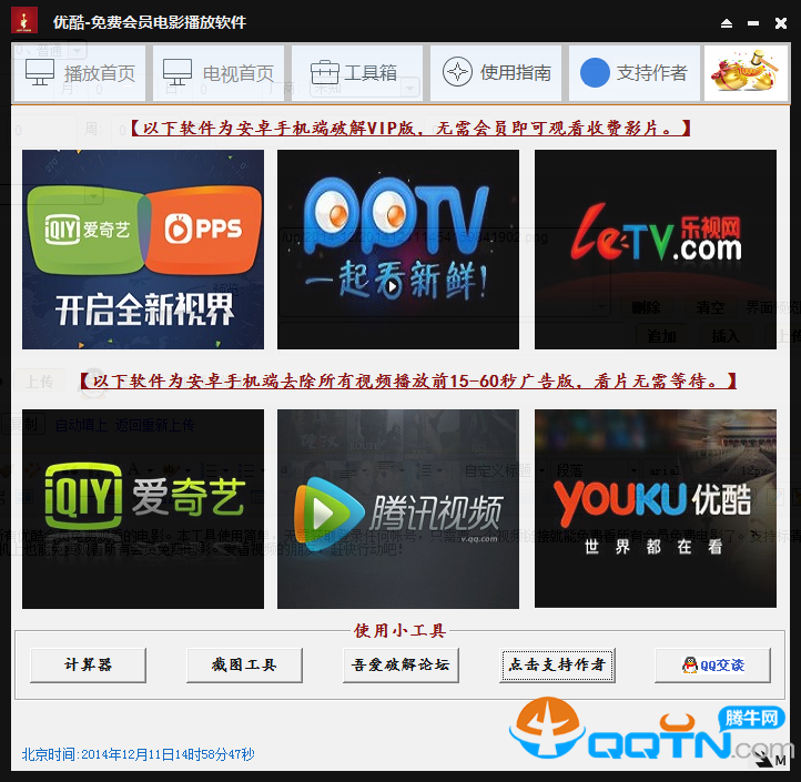 3、工具箱,提供爱奇艺pps、PPTV、乐视视频、爱奇艺视频、腾讯视频、优酷视频安卓手机端破解VIP版,无需会员即可观看收费影片。