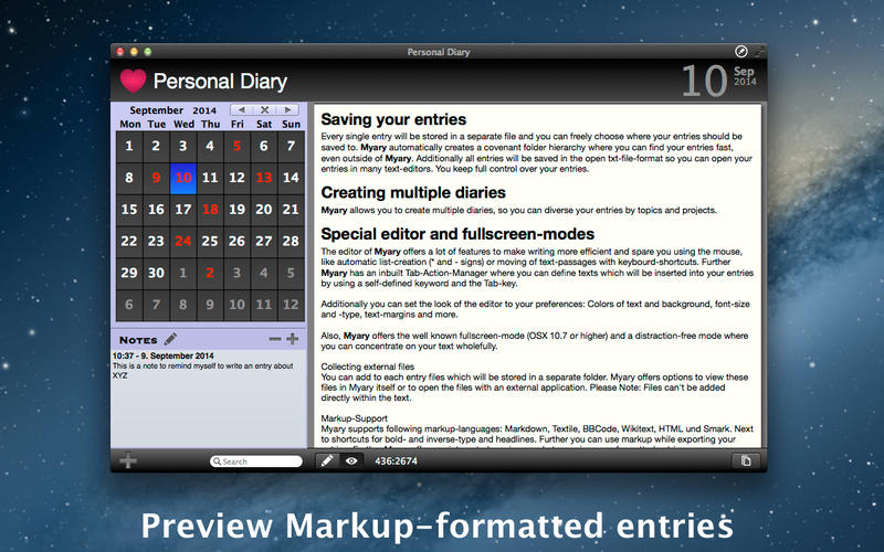 2、特殊的编辑器和全屏-模式。 Myary的编辑器提供了很多功能,使书写更高效,使用鼠标,如自动列表创建(*和 - 符号)饶你或文本的段落移动与键盘快捷键。此外,您可以设置编辑您的喜好的外观:文本和背景,字体大小和型,文字的利润率和更多的颜色。此外,Myary提供众所周知的全屏模式(OS X 10.7狮子和10.8山狮)和分心,自由模式,你可以专注于你的文字全。