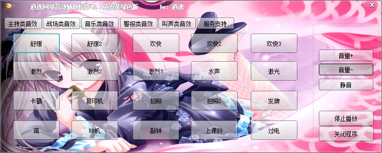 逍遥网络音效辅助软件是目前为止音效素材最多、最好用的一款音效辅助软件。软件提供了主持类音效、战场类音效、音乐类音效、警报类音效、叫声类音效等几大类音效。软件完全免费使用,同时可以自由调整音效的音量大小。