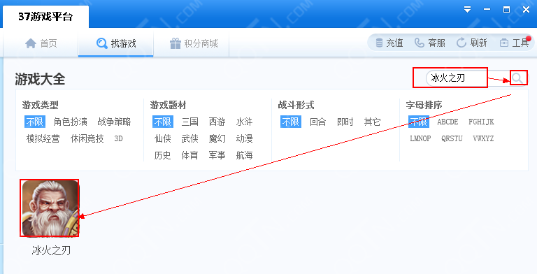 安装“游戏盒子”——找游戏——搜索“冰火之刃”——进入“冰火之刃”游戏