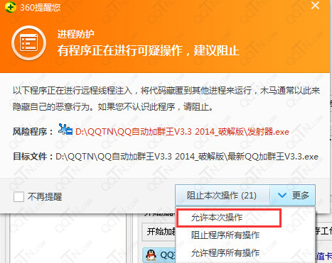 二、该加群是调用QQ客户端,模拟人工加群的,可能会被杀毒软件误认为危险行为,其实这是很安全的,不用担心,所以最好将加群软件加入杀毒软件信任列表或者暂时关掉杀毒软件,以免加群时杀毒软件弹出提示造成加群失败