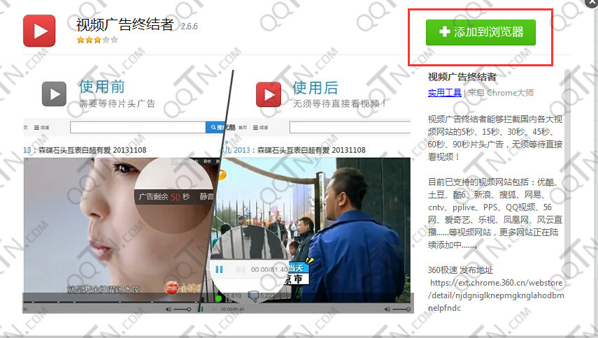 视频广告终结者能够去除网页视频所有类型广告,如常见的片头15秒、30秒、60秒、90秒等等。支持全网视频站广告去除,如优酷土豆、爱奇艺、搜狐、乐视等。无论你是在哪个视频网站看,安装本插件之后,所有视频广告统统去除,让你从此看视频不再等待!