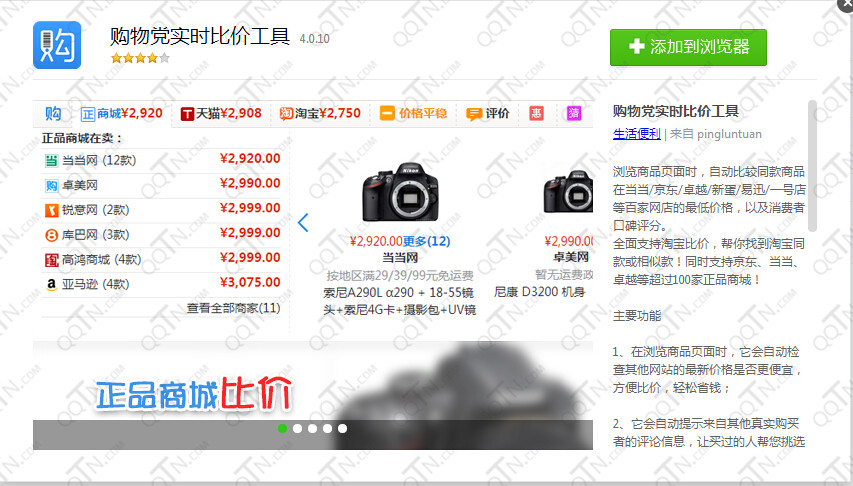 浏览商品页面时,自动比较同款商品在当当/京东/卓越/新蛋/易迅/一号店等百家网店的最低价格,以及消费者口碑评分。