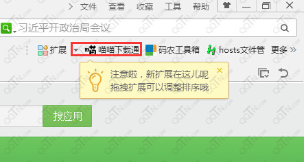 7、添加成功,在浏览器右上方扩展栏就可以显示刚才安装的喵喵下载通插件扩展,点击打开进行设置