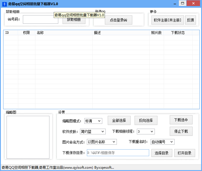 奇易QQ空间相册批量下载器是由奇Q吧(cqeosft)官方出品,今日首发。是一款完全免费的QQ空间相册批量下载工具,可以用来批量下载自己QQ空间相册或是QQ好友空间相册,用于空间相册照片搬家、备份、收藏。软件采用多线程运行,可以选择软件运行线程、图片命名方式、下载重名时操作等。非常强大的一款工具,是目前唯一一款最新可用的空间相册下载工具。