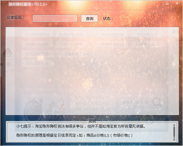 宝贝关键词排名、信用查询/买卖、店铺综合查询、隐形降权查询、动态评分查询、快递查询、手机或IP查询